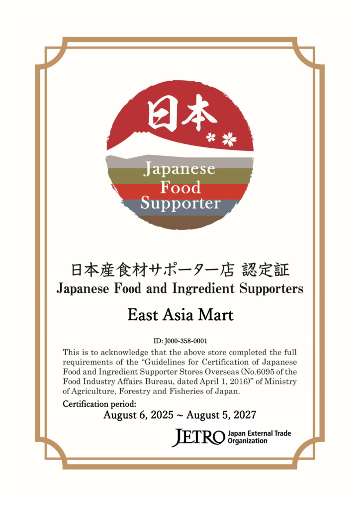 East Asia Mart on virallisesti tunnustettu Japanese Food and Ingredient Supporter -toimijaksi Japanin ulkomaankauppajärjestön (JETRO) toimesta.